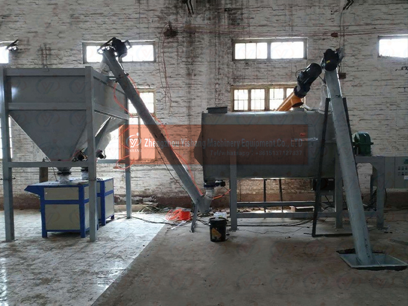 skim coat tile glue adhesive mixing plant dry mortar production line produced by our company is based on multi-screw dry powder mixer, adding electric feeder, material storage tank, automatic filling machine and electric control cabinet, thus forming a reasonable and convenient simple flow line operation system. After the material is evenly mixed, it enters the storage bin through the feeding tube. The dry powder mixer can be continuously fed and stirred, which improves the production efficiency. The height of simple  masonry plaster lime brick dry mortar mixer dry mortar production line is not more than 3 meters, to solve the traditional dry mortar production line need to raise the workshop, but also to achieve automatic measurement, automatic filling, more time and effort saving, in the case of small investment really realized automatic feeding, automatic discharging, is a simple and practical dry mortar production line.