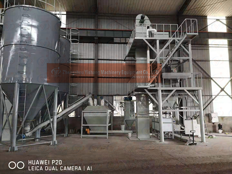 The equipment adopts a tower process in layout, conveying all pre processed raw materials to the top of the raw material silo, The raw materials rely on their own gravity to flow out of the silo, and spiral conveyor is used for metering, mixing, and packaging in the packaging machine,After being bagged or stored in bulk in bulk trucks or finished product warehouses, it becomes the final product, and all production is carried out by electricity,Brain control system operation, high ingredient accuracy, flexible use, and the use of closed production system equipment enable on-site cleaning, Clean and dust-free, ensuring the health of workers.